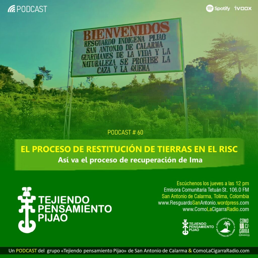 Vuelve el equipo de Tejiendo pensamiento Pijao con su caminar de la palabra. En esta oportunidad los Pijaos del Resguardo Indígena San Antonio de Calarma – RISC (Tolima, Colombia), reciben a funcionarios de la Unidad de Restitución de Tierras, quienes realizan una visita al territorio para conocer el trabajo que viene realizando el pueblo Pijao frente al proceso de recuperación de Ima, la Madre tierra Pijao.